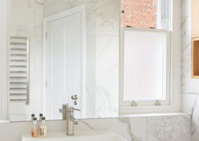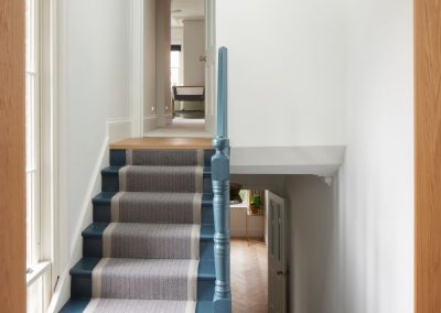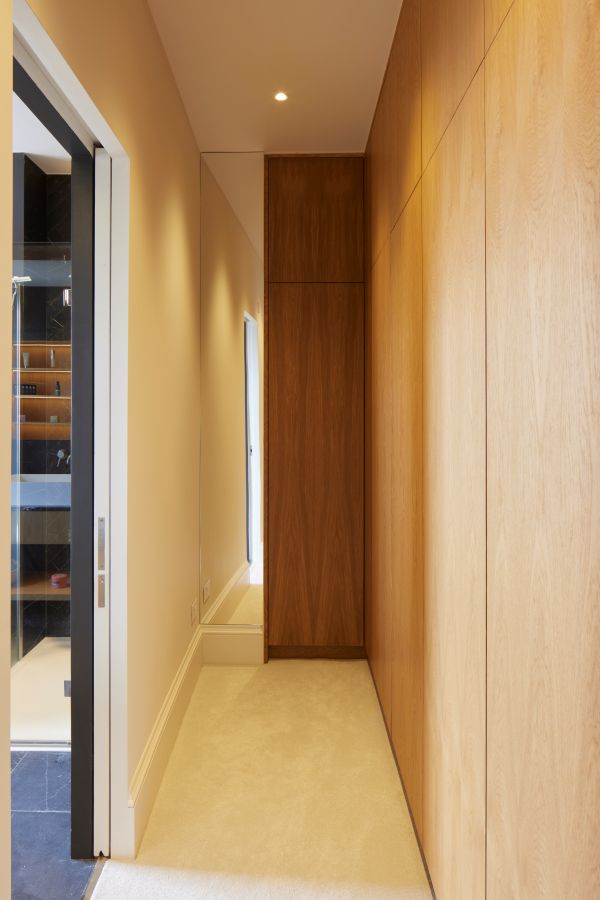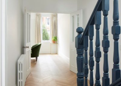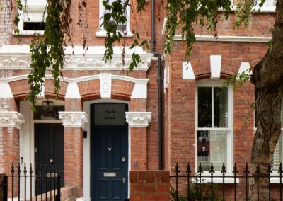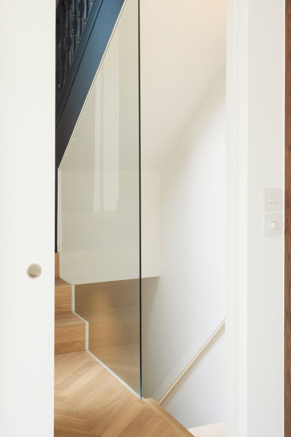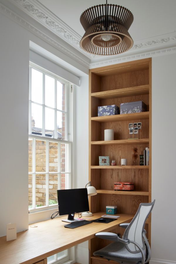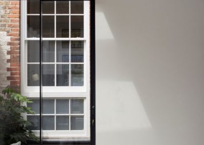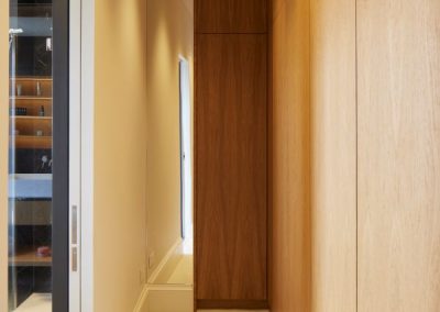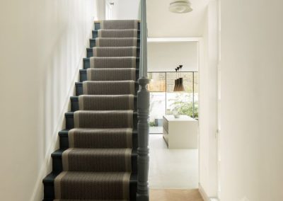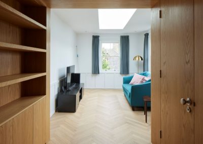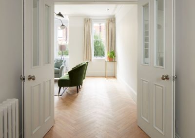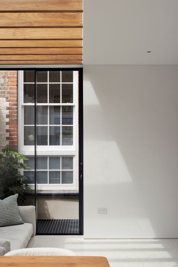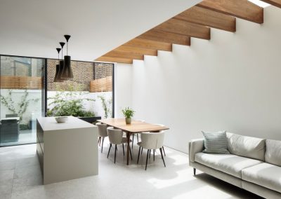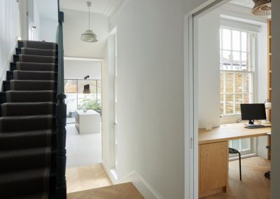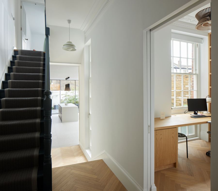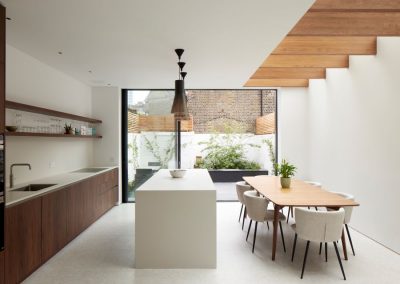 The kitchen was fitted with walnut doors to match the extension’s structure, paired with pale flooring and countertops for contrast. Upstairs, the layout was redesigned to provide practical bedrooms, bathrooms, and living areas across all floors. A small internal courtyard brings extra light into the centre of the home, including a window into the old cellar. Frameless sliding doors connect the front of the house to the garden at the rear, with a new home office formed beside the courtyard.