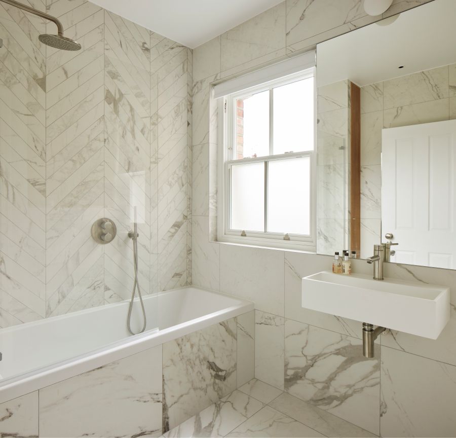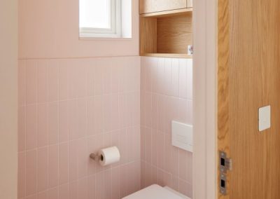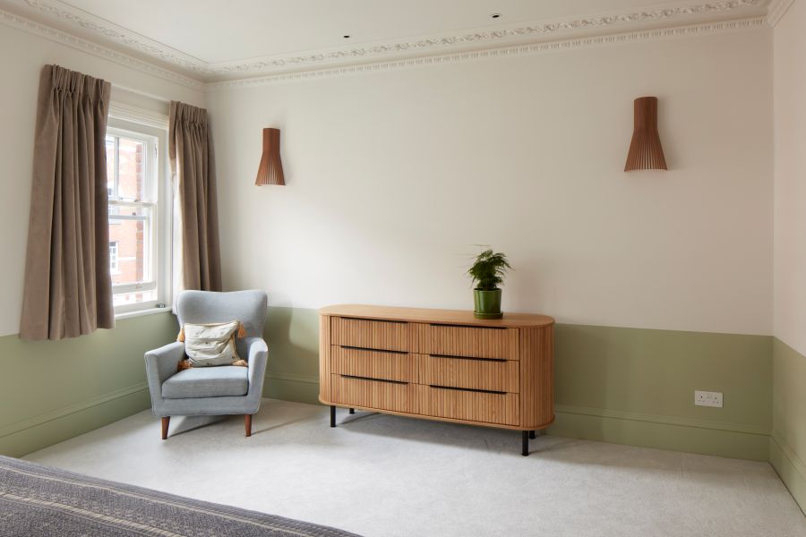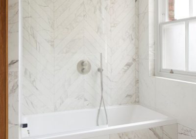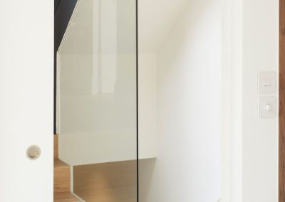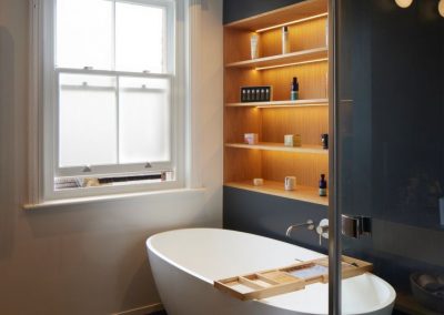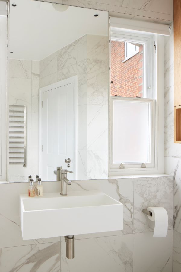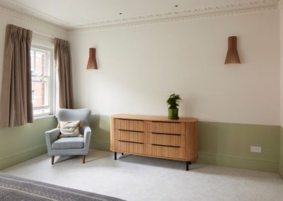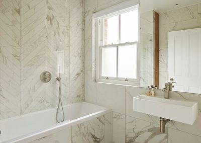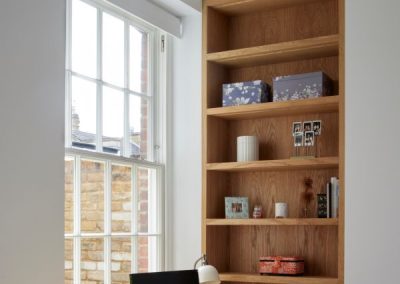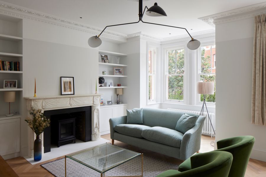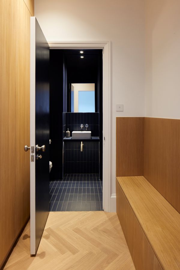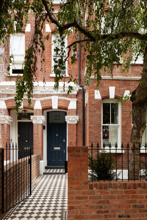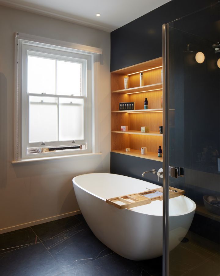 The kitchen was fitted with walnut doors to match the extension’s structure, paired with pale flooring and countertops for contrast. Upstairs, the layout was redesigned to provide practical bedrooms, bathrooms, and living areas across all floors. A small internal courtyard brings extra light into the centre of the home, including a window into the old cellar. Frameless sliding doors connect the front of the house to the garden at the rear, with a new home office formed beside the courtyard.