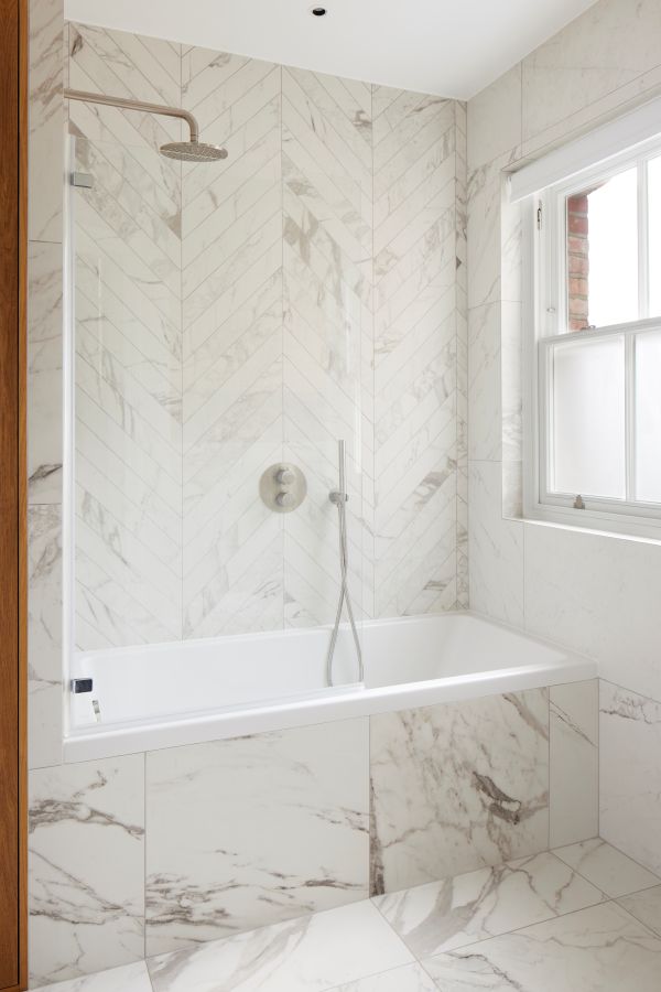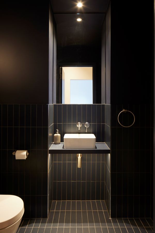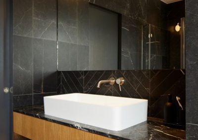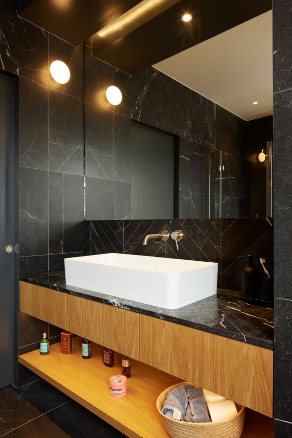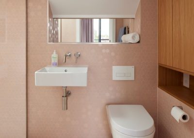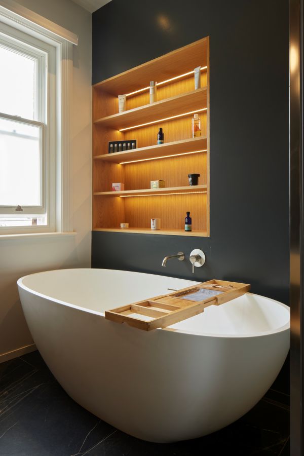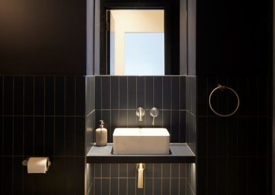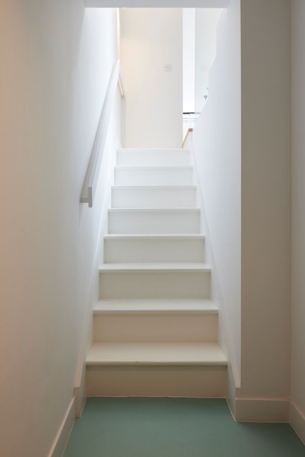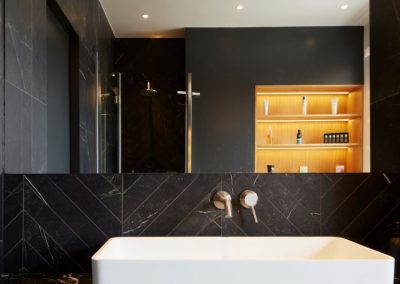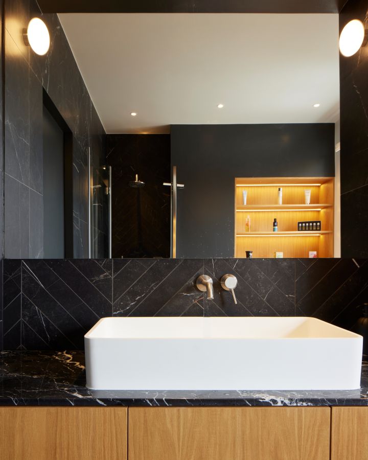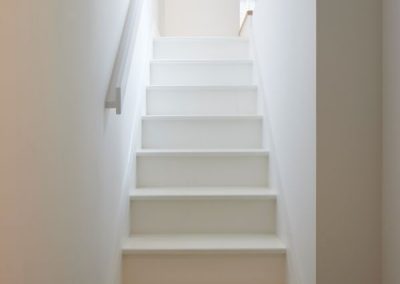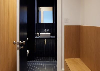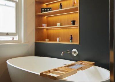 The kitchen was fitted with walnut doors to match the extension’s structure, paired with pale flooring and countertops for contrast. Upstairs, the layout was redesigned to provide practical bedrooms, bathrooms, and living areas across all floors. A small internal courtyard brings extra light into the centre of the home, including a window into the old cellar. Frameless sliding doors connect the front of the house to the garden at the rear, with a new home office formed beside the courtyard.