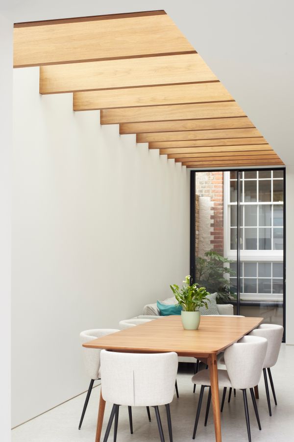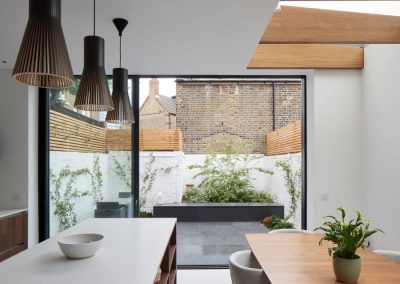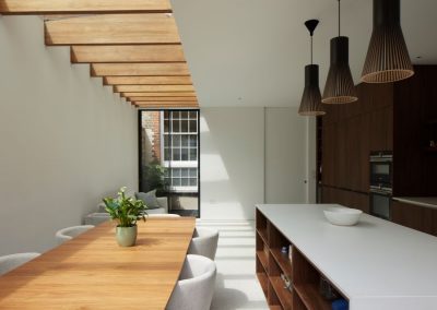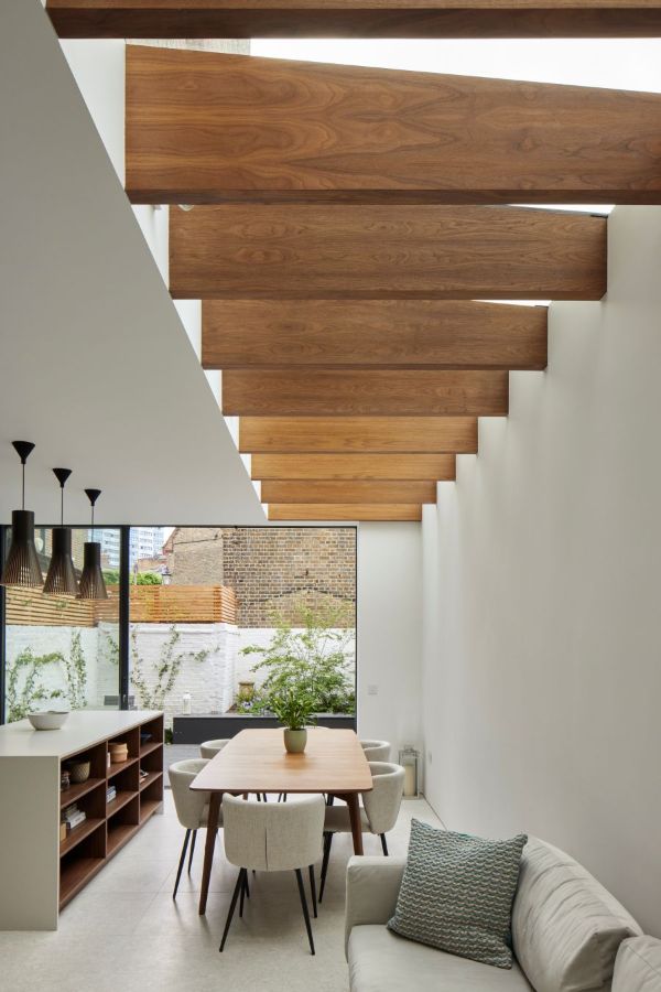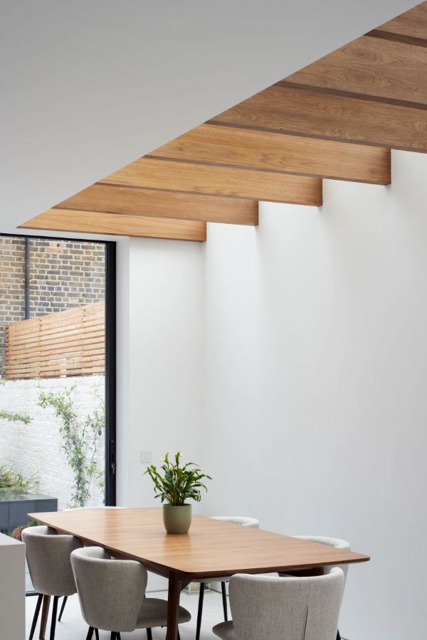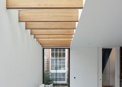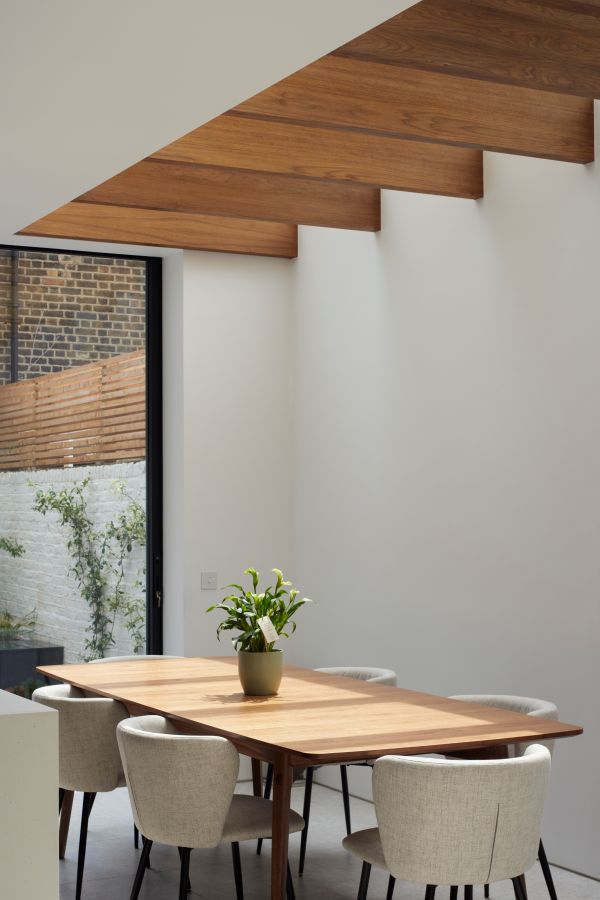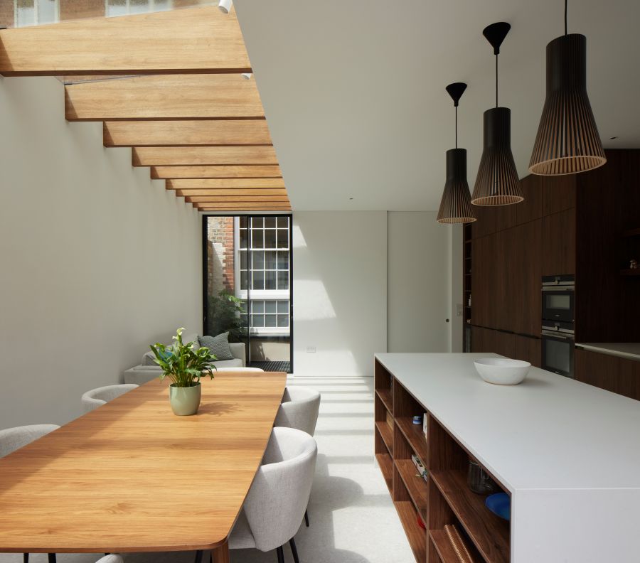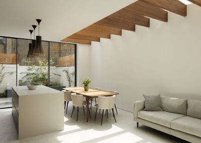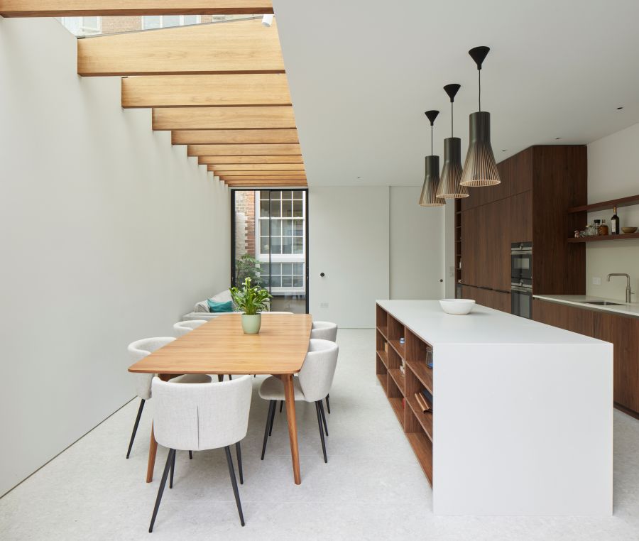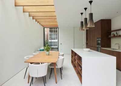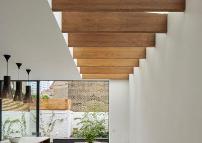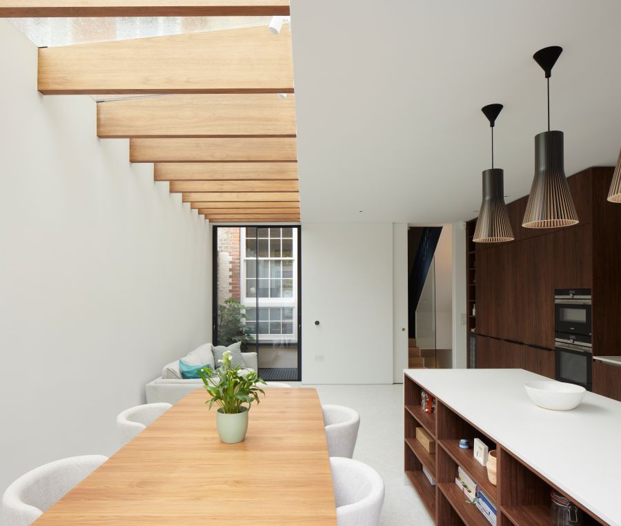 The house was fully reconfigured and extended to create a bright, modern family home while maintaining privacy from the neighbouring flats. A striking rear extension was added, with slim-framed glazing and deep walnut rafters under a full glass roof. These timber fins provide privacy while still allowing natural light and sky views into the new kitchen and living area.