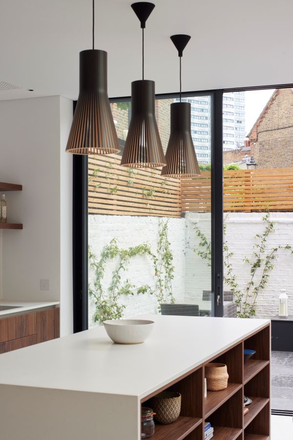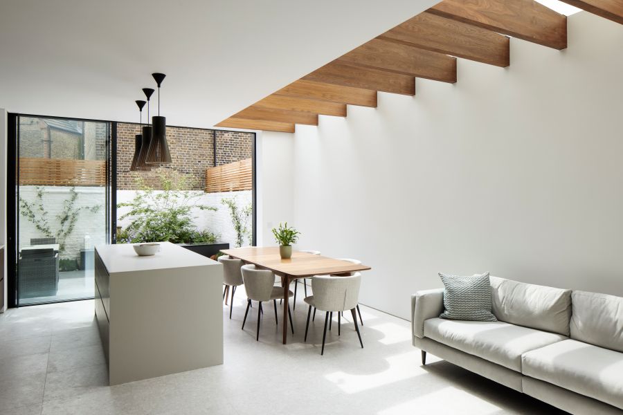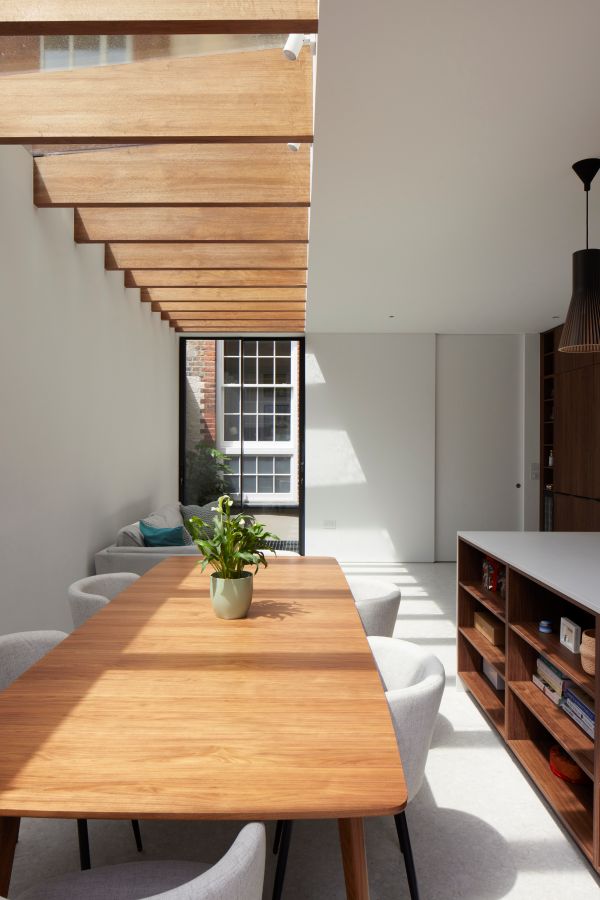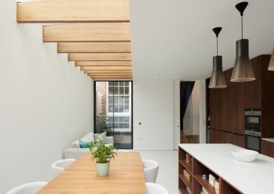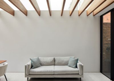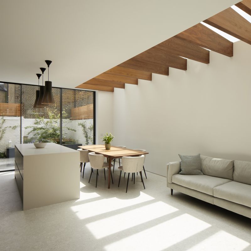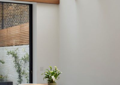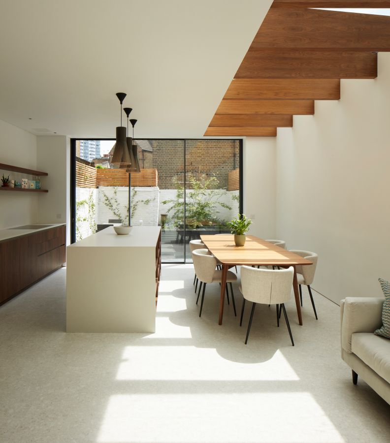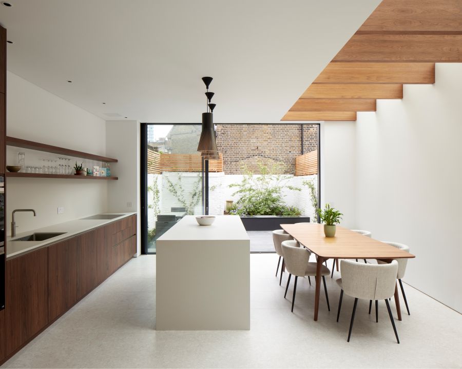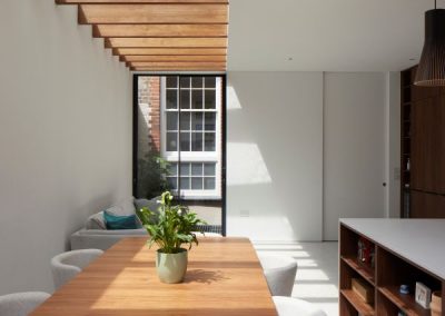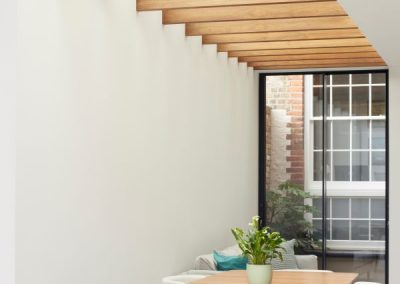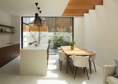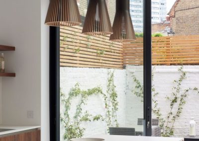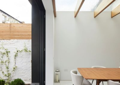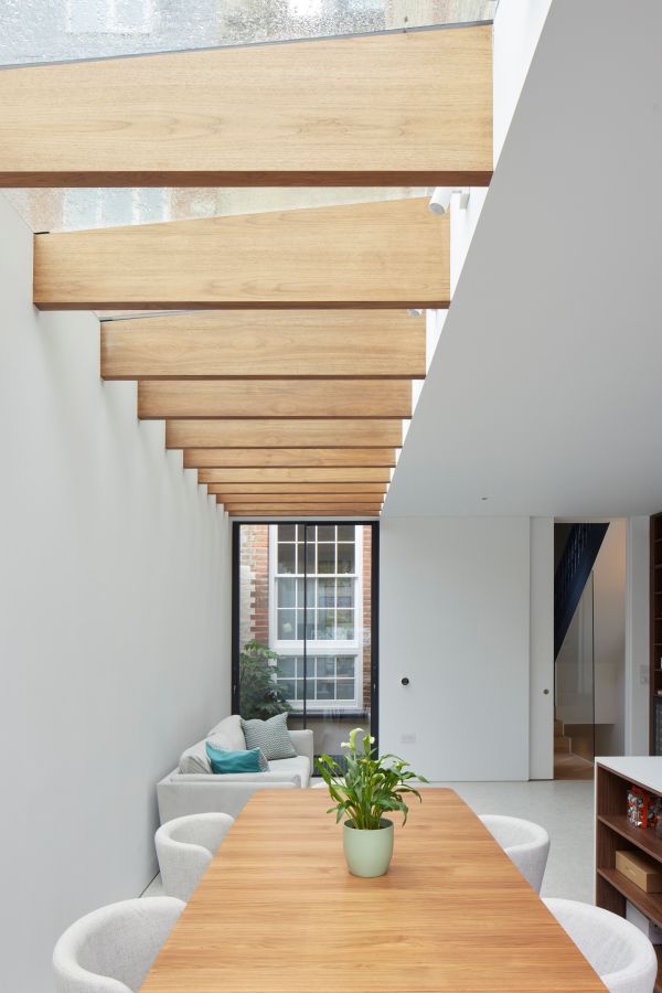 The house was fully reconfigured and extended to create a bright, modern family home while maintaining privacy from the neighbouring flats. A striking rear extension was added, with slim-framed glazing and deep walnut rafters under a full glass roof. These timber fins provide privacy while still allowing natural light and sky views into the new kitchen and living area.