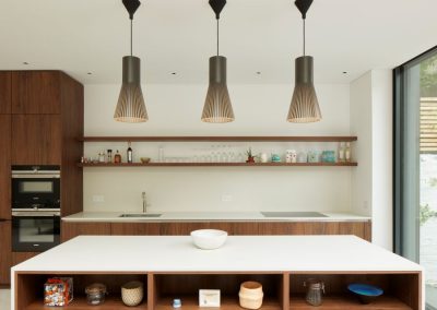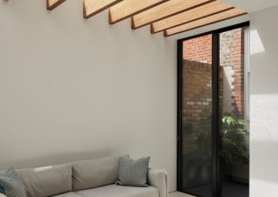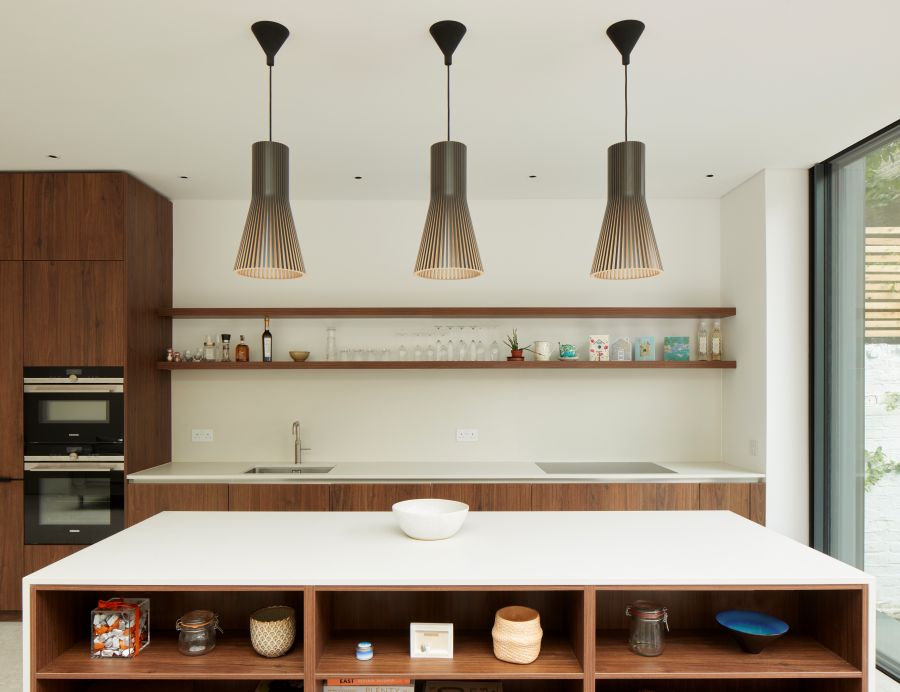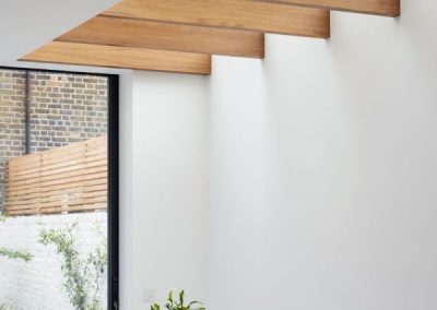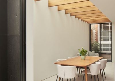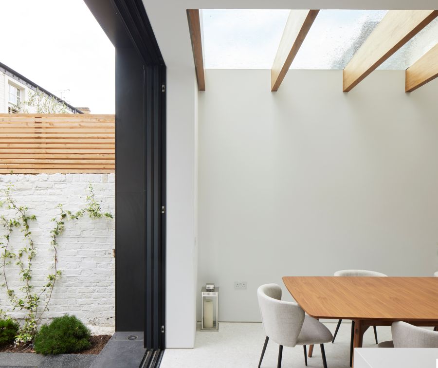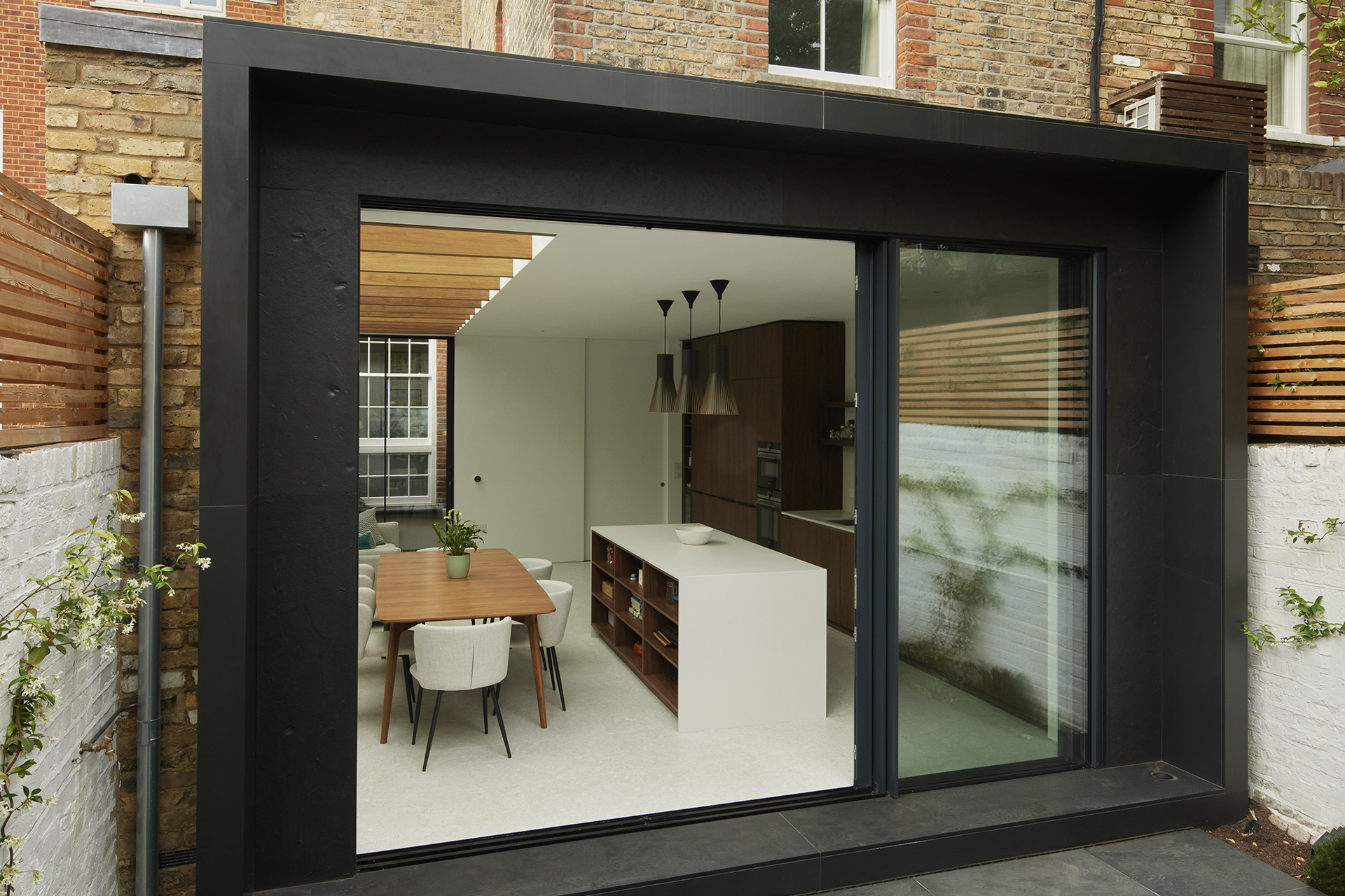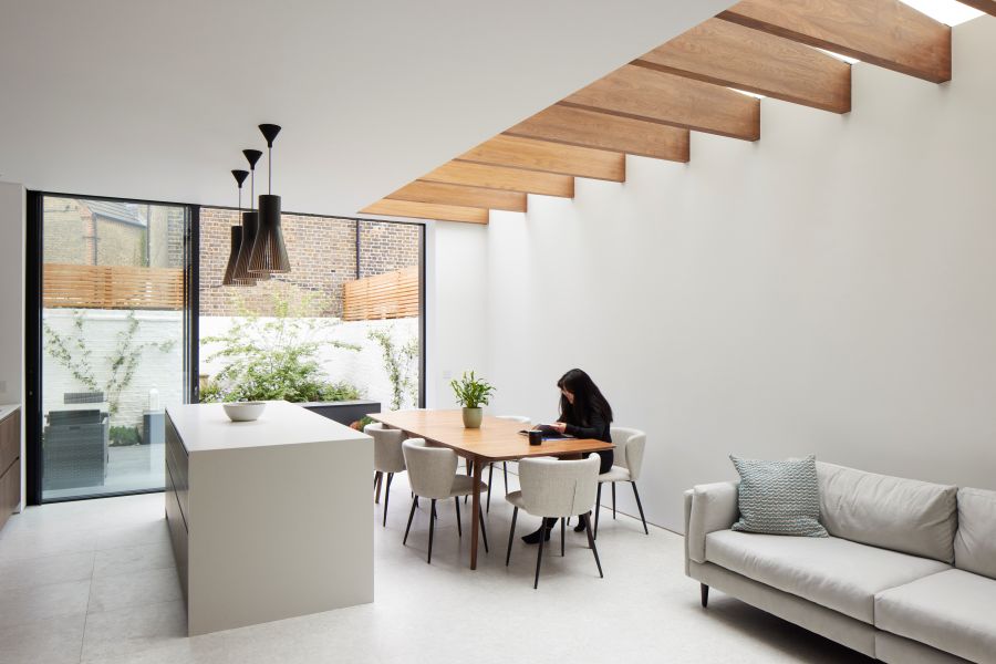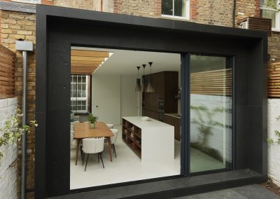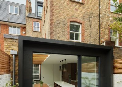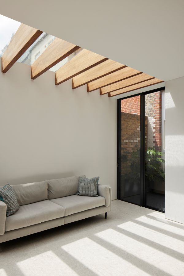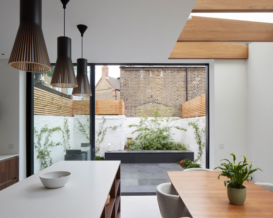 The house was fully reconfigured and extended to create a bright, modern family home while maintaining privacy from the neighbouring flats. A striking rear extension was added, with slim-framed glazing and deep walnut rafters under a full glass roof. These timber fins provide privacy while still allowing natural light and sky views into the new kitchen and living area.
