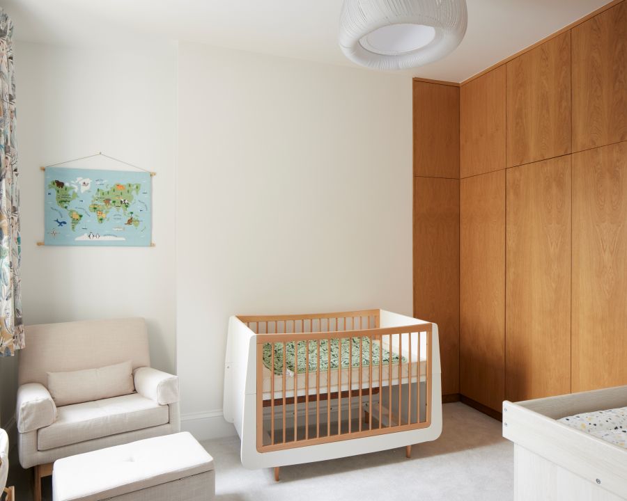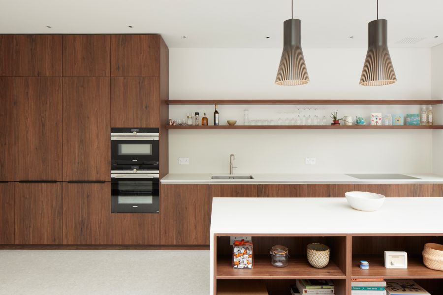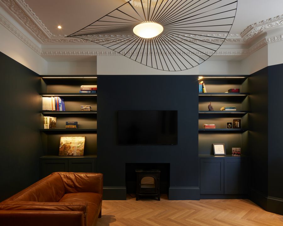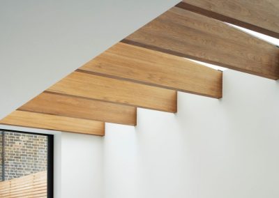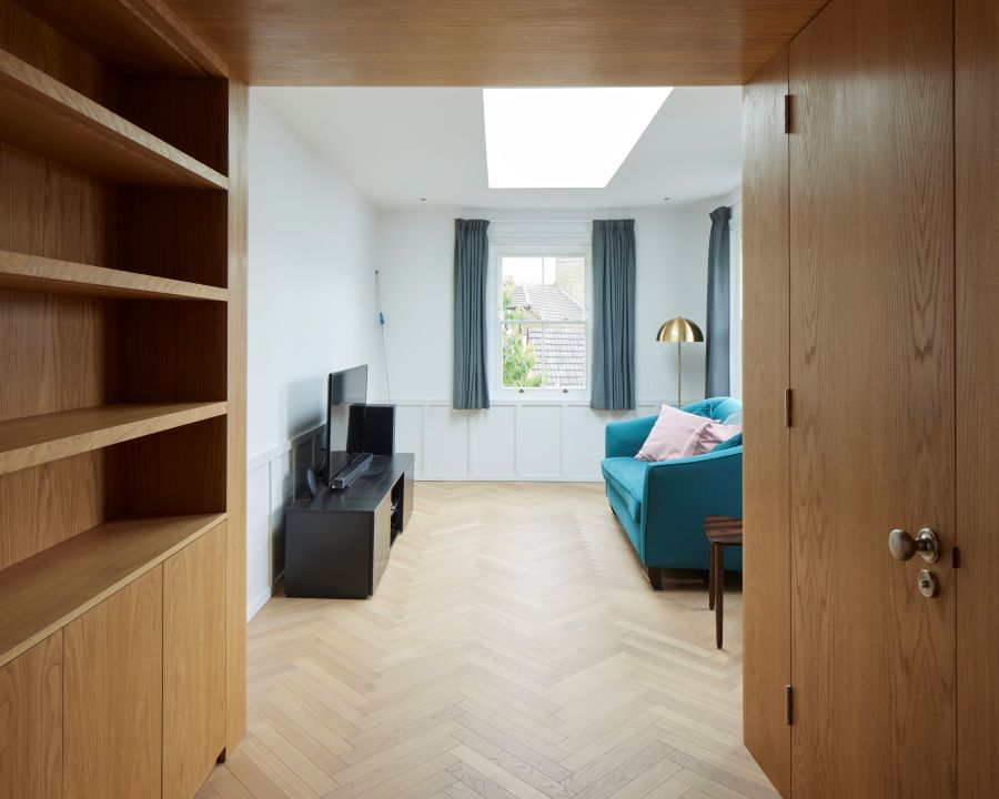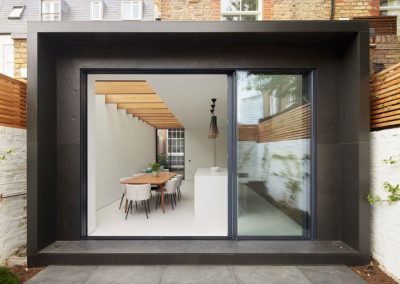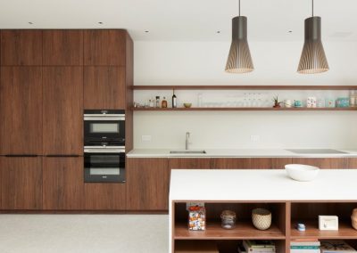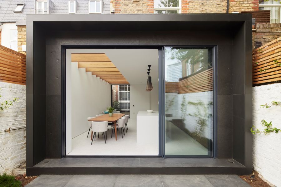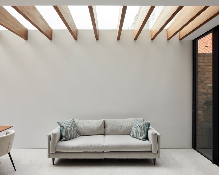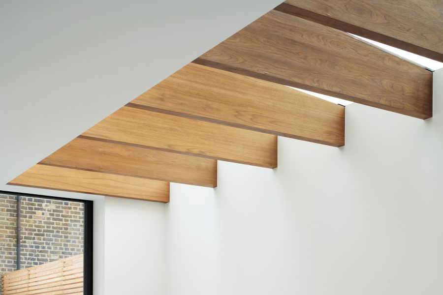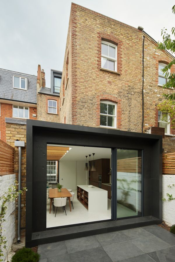 The house was fully reconfigured and extended to create a bright, modern family home while maintaining privacy from the neighbouring flats. A striking rear extension was added, with slim-framed glazing and deep walnut rafters under a full glass roof. These timber fins provide privacy while still allowing natural light and sky views into the new kitchen and living area.