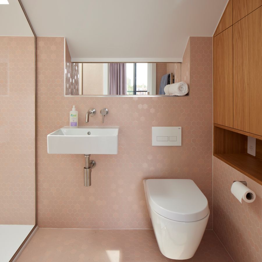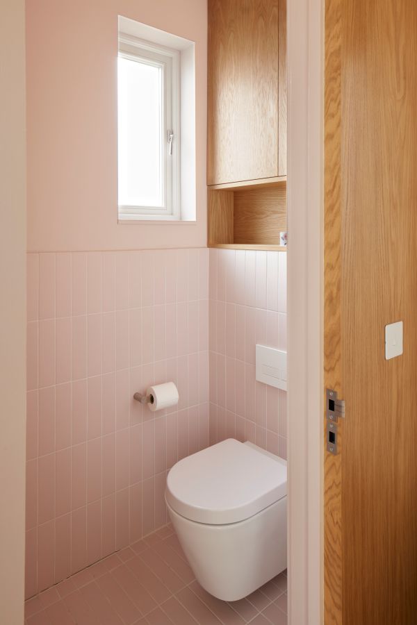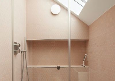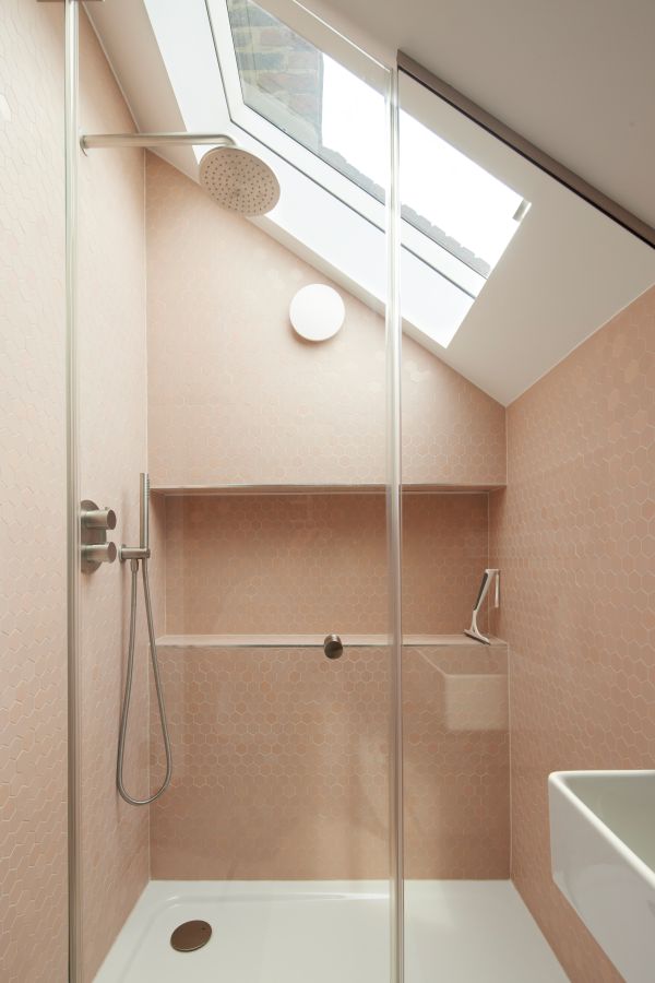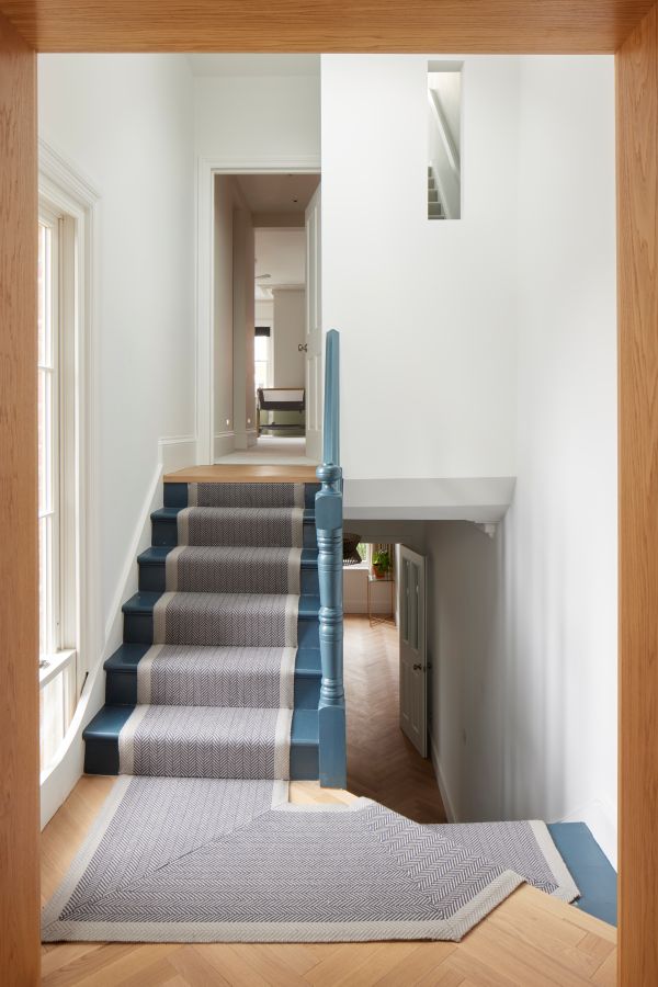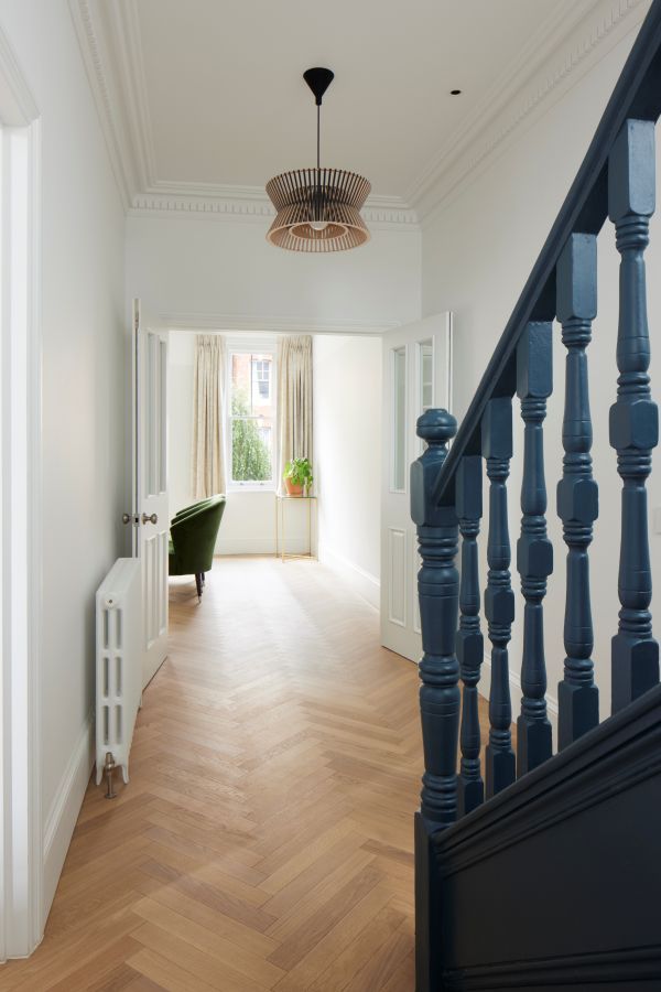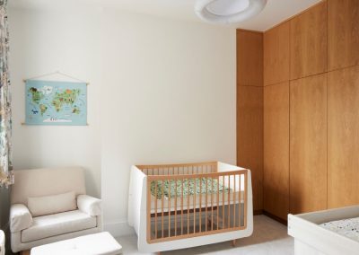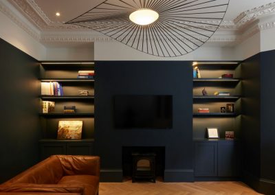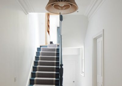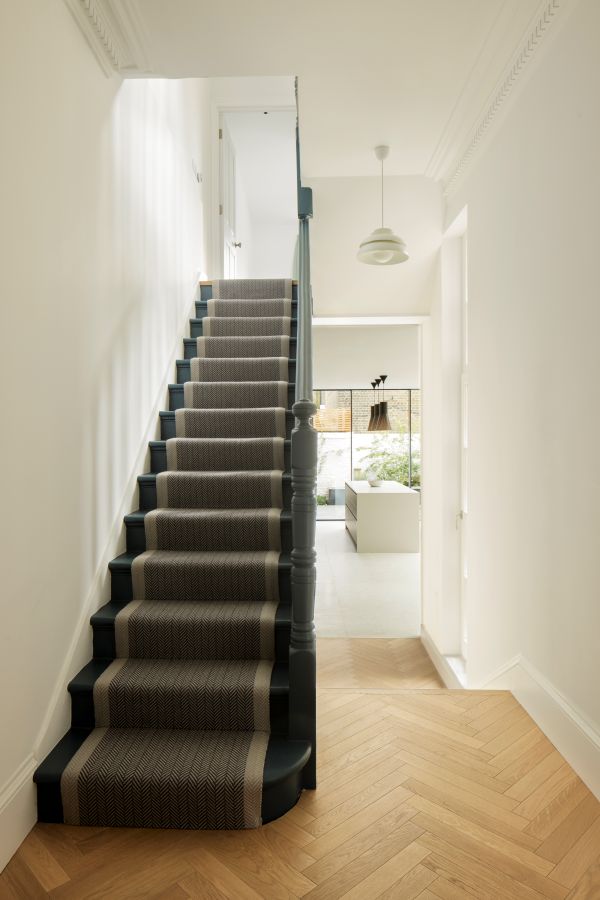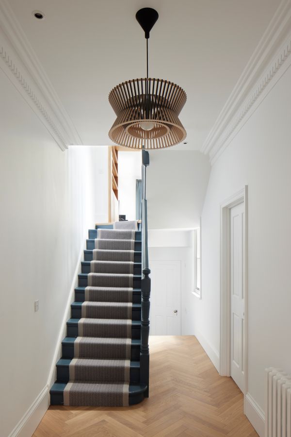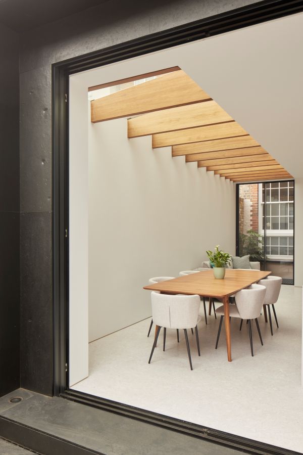 The house was fully reconfigured and extended to create a bright, modern family home while maintaining privacy from the neighbouring flats. A striking rear extension was added, with slim-framed glazing and deep walnut rafters under a full glass roof. These timber fins provide privacy while still allowing natural light and sky views into the new kitchen and living area.
